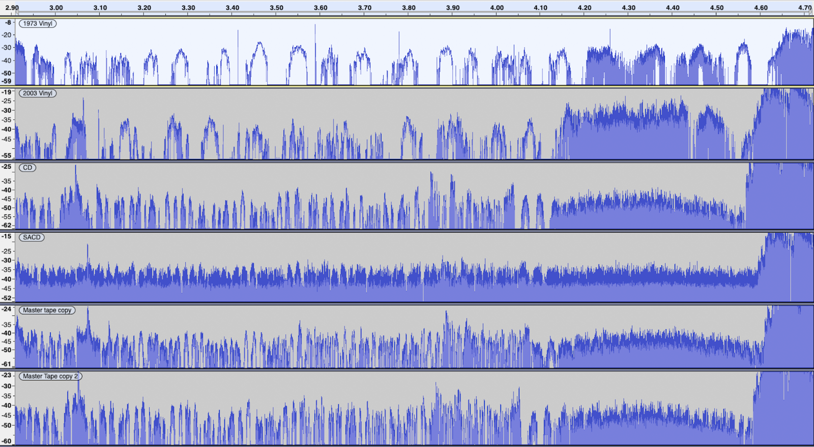 順便看4~4.5秒這段,各版本都不太相同,所以說,該是master不同,唱片製作會針對不同載體的特性與設定的市場的音響設備mastering。